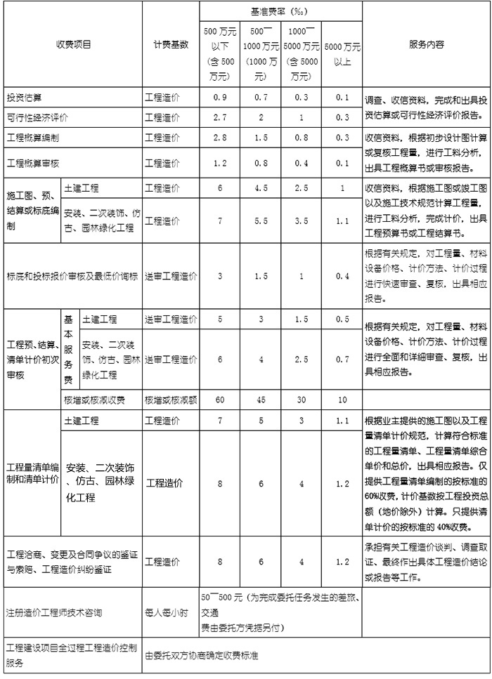 5、執(zhí)行全過程跟蹤審計服務(wù)收費按上述標準,采用差額累進方法計取,不再收取其他費用(如結(jié)算、決算等)。